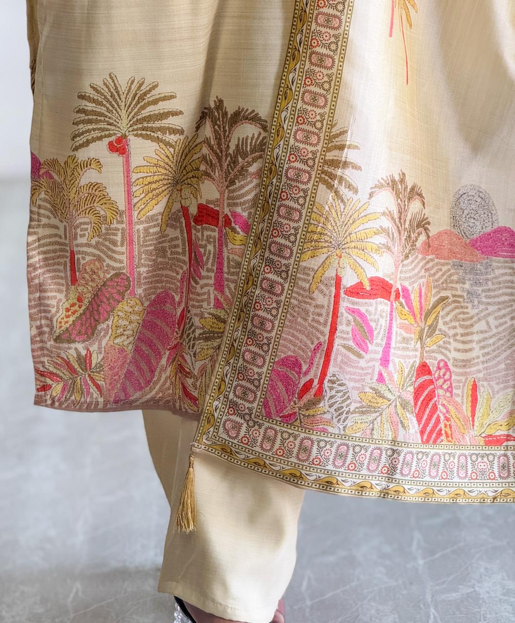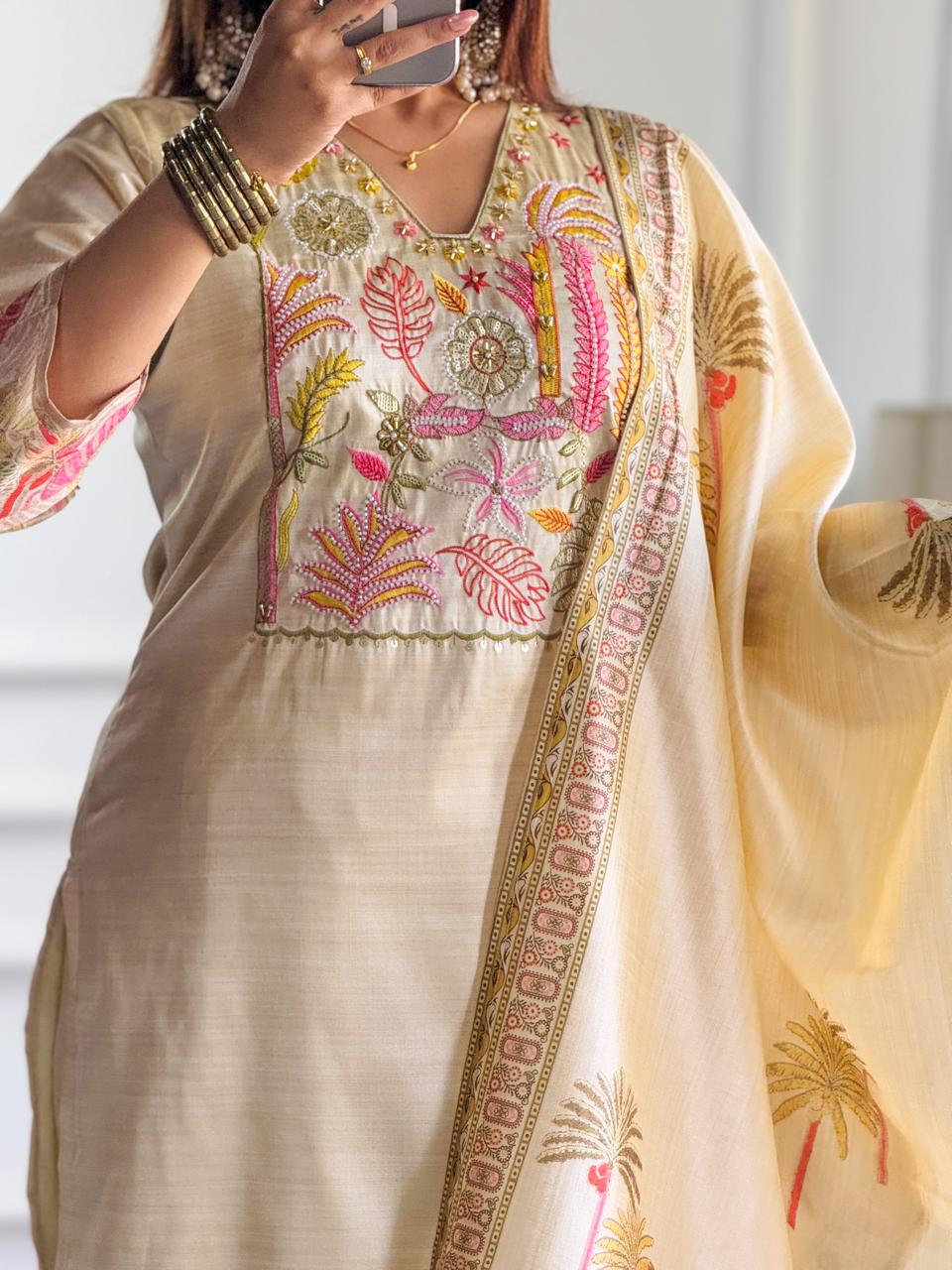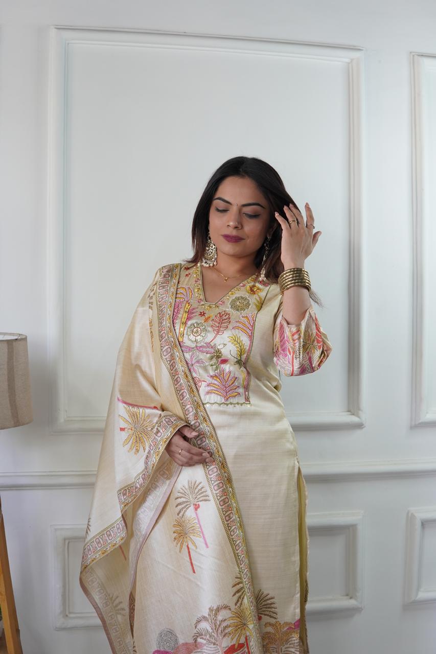 Cream Silk Suit with Tropical Embroidered and handwork Dupatta