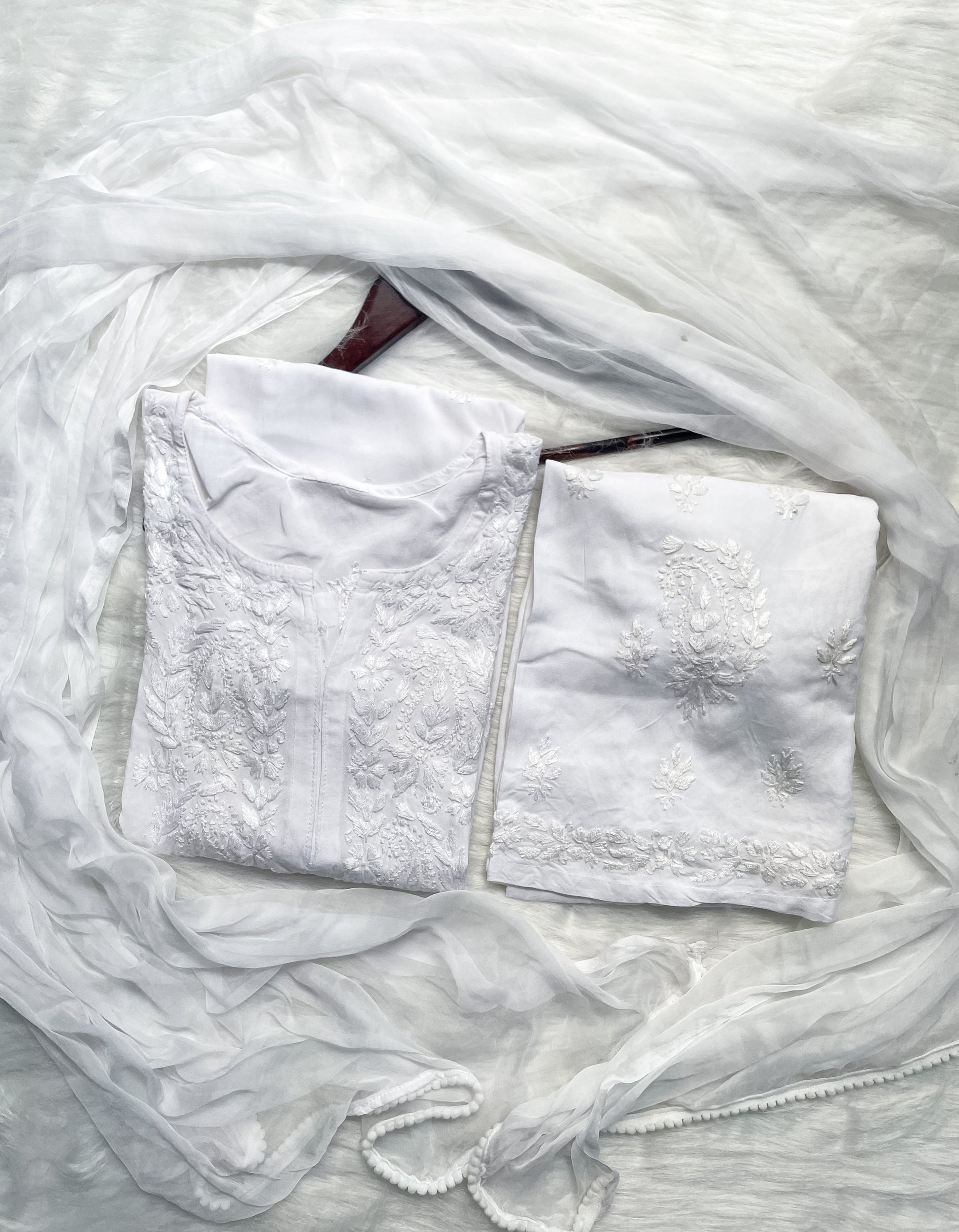 Ombre Dyed Shaded Rayon Lucknowi Chikankari Kurti, Palazzo and Dupatta Set.