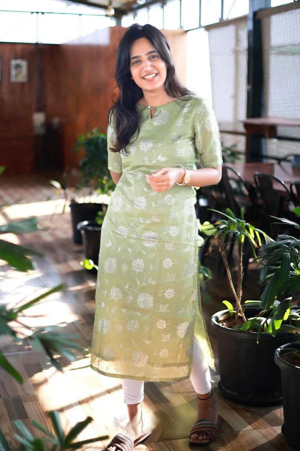 Elevate your office wardrobe with this stunning Pista Green Kurti. Its elegant color and classic design will make you look classy and professional, making it perfect for any workplace. Made with high-quality materials, this kurti is stylish, comfortable, and perfect for all-day wear. UpgrTrande your office style today with this must-have kurti.