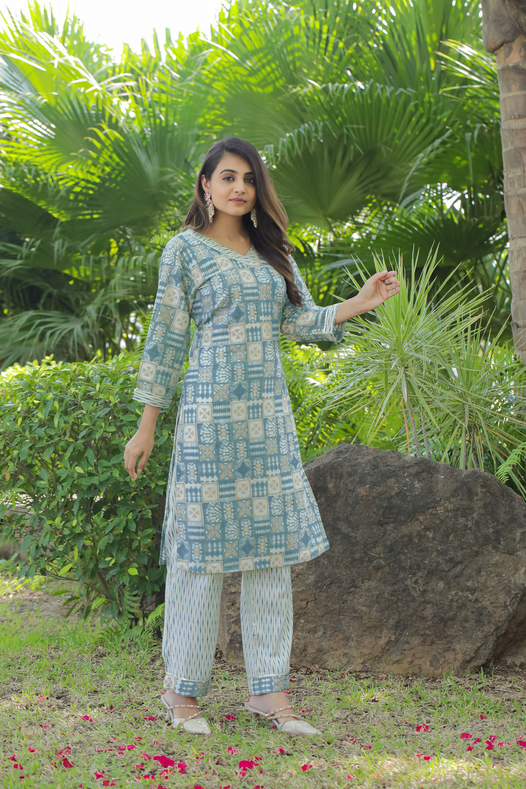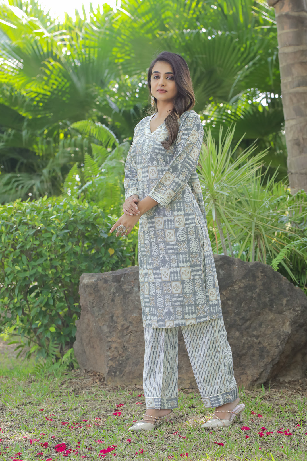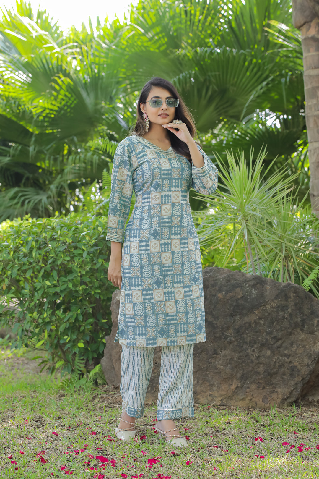 Stylish cord set for women featuring a floral printed kurta with button details and flared.perfect for a trendy ethnic look.