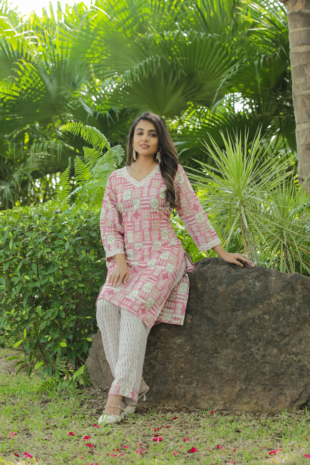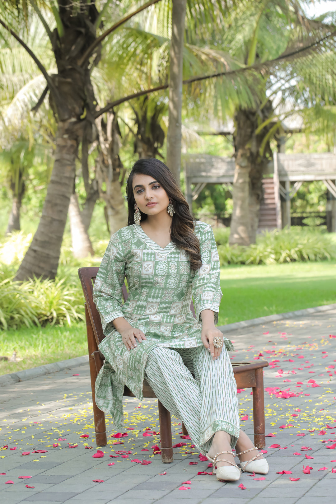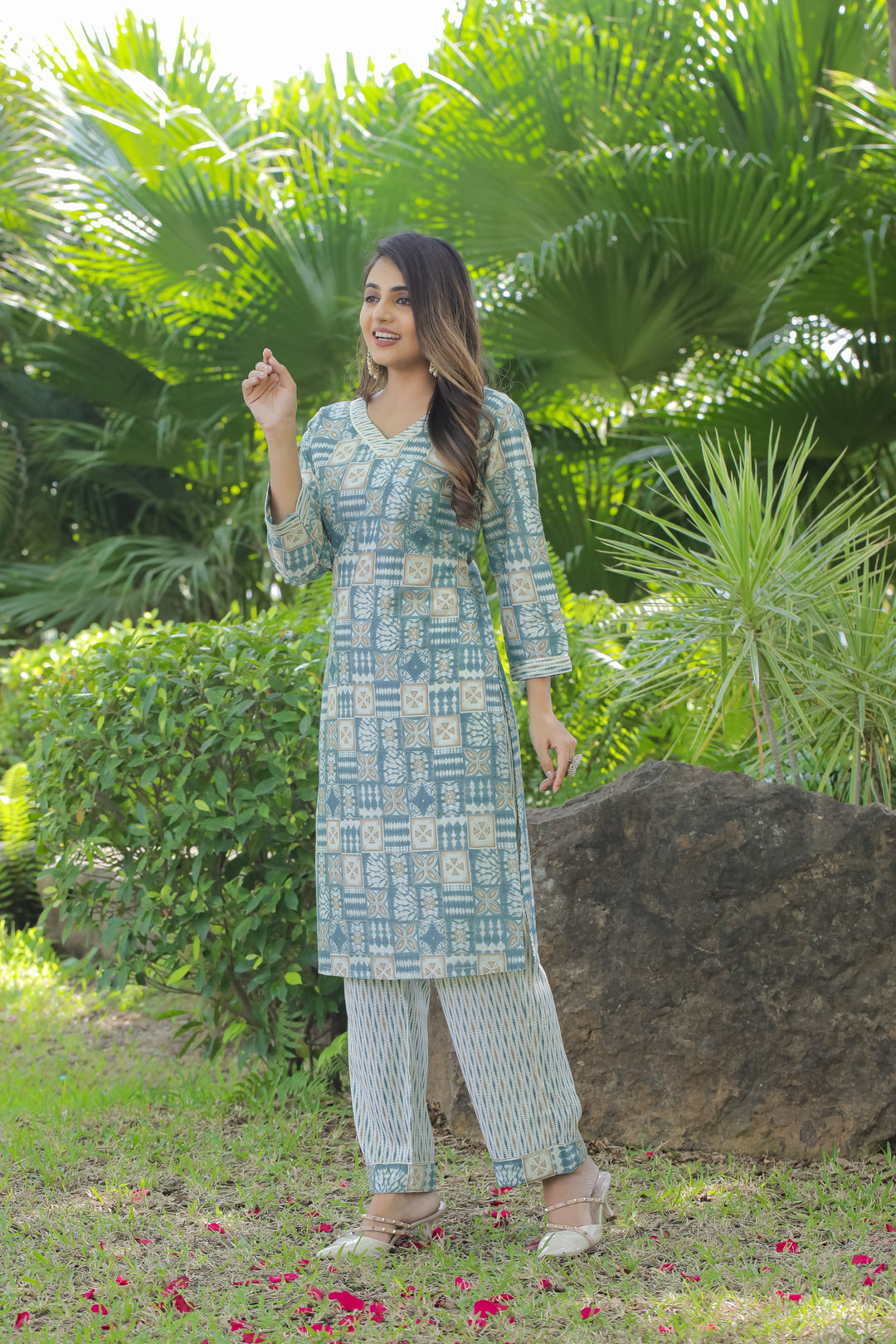 Stylish cord set for women featuring a floral printed kurta with button details and flared.perfect for a trendy ethnic look.