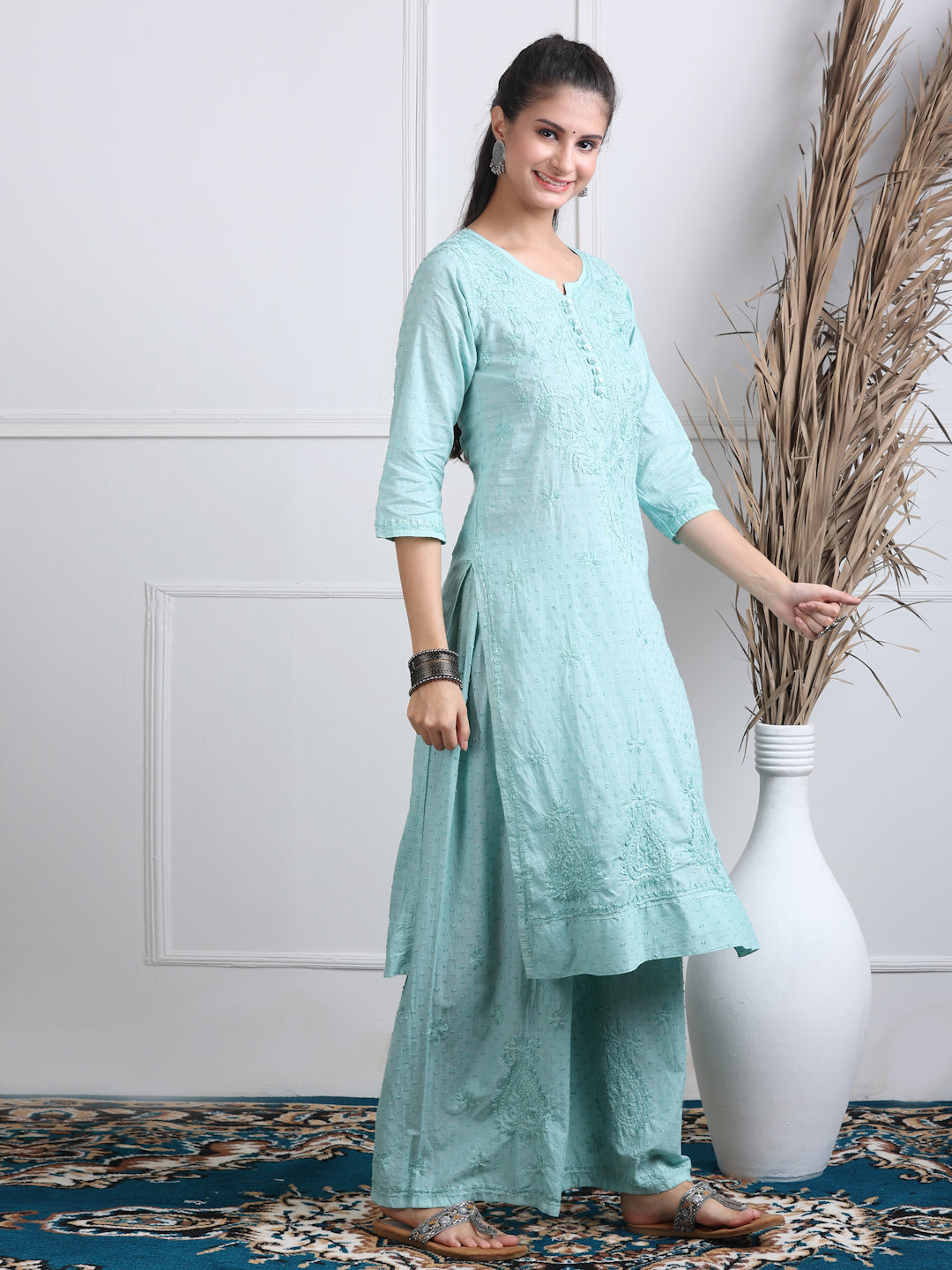 Style Name: Handcrafted Chikankari Soft Cotton Kurti Palazzo and Dupatta Set